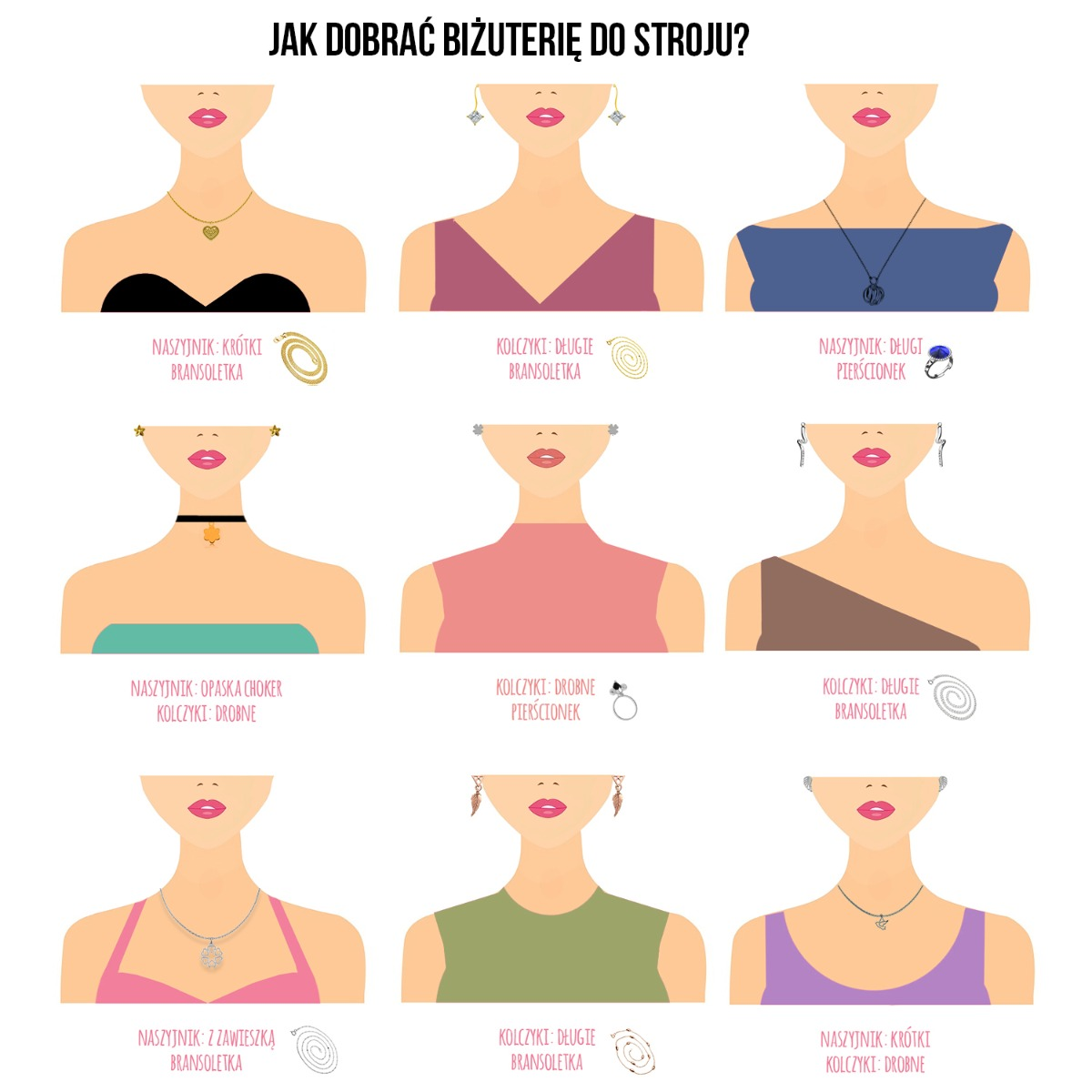 Po wyborze sukienki na wieczór nie możesz się zdecydować, czy założyć kolczyki, naszyjnik czy bransoletkę? Czy wszystko na raz? Nie wiesz, z czym nosić choker, a z czym kolię? Kiedy założyć długie kolczyki, a kiedy wkładane sztyfty? Zobacz nasz przewodnik, dzięki któremu już nigdy nie będziesz miała takich dylematów :)
